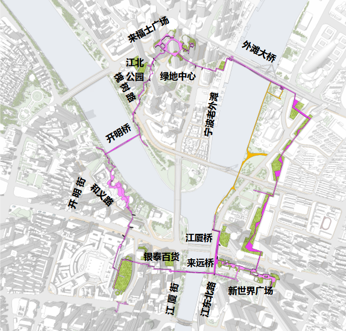 宁波老外滩及延伸段、和义大道、书城、外滩大桥、新江桥的建设,连接和义大道与东鼓道、天一广场的碶闸街地道贯通,灵桥的维修、核心区三江六岸滨江休闲带以及绿地中心、月湖西区、南塘河历史街区等重点地块的建成已经为三江口核心区一小时步行圈、历史城区文化绿道的建设奠定了扎实的基础,连接海曙、江北跨姚江的开明桥以及联通江北核心区消费商圈的健康步道对提升三江口核心区城市品质具有十分重要意义。